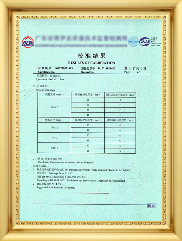 | 保护层检测精度: | 6—79mm,误差≤±1mm;80—119mm,误差≤±2mm;120—190mm,误差≤±3mm | ||